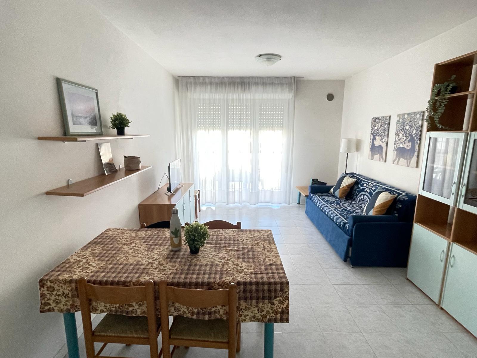 The apartment is located in the Colombo residence on Viale S. Margherita 119, a 5-minute walk from the beach and 15 minutes from the city center, with underground parking available. There is access to the rooftop pools. It is suitable for a family of 4 in two bedrooms, with a sofa bed in the living room for one extra person.
