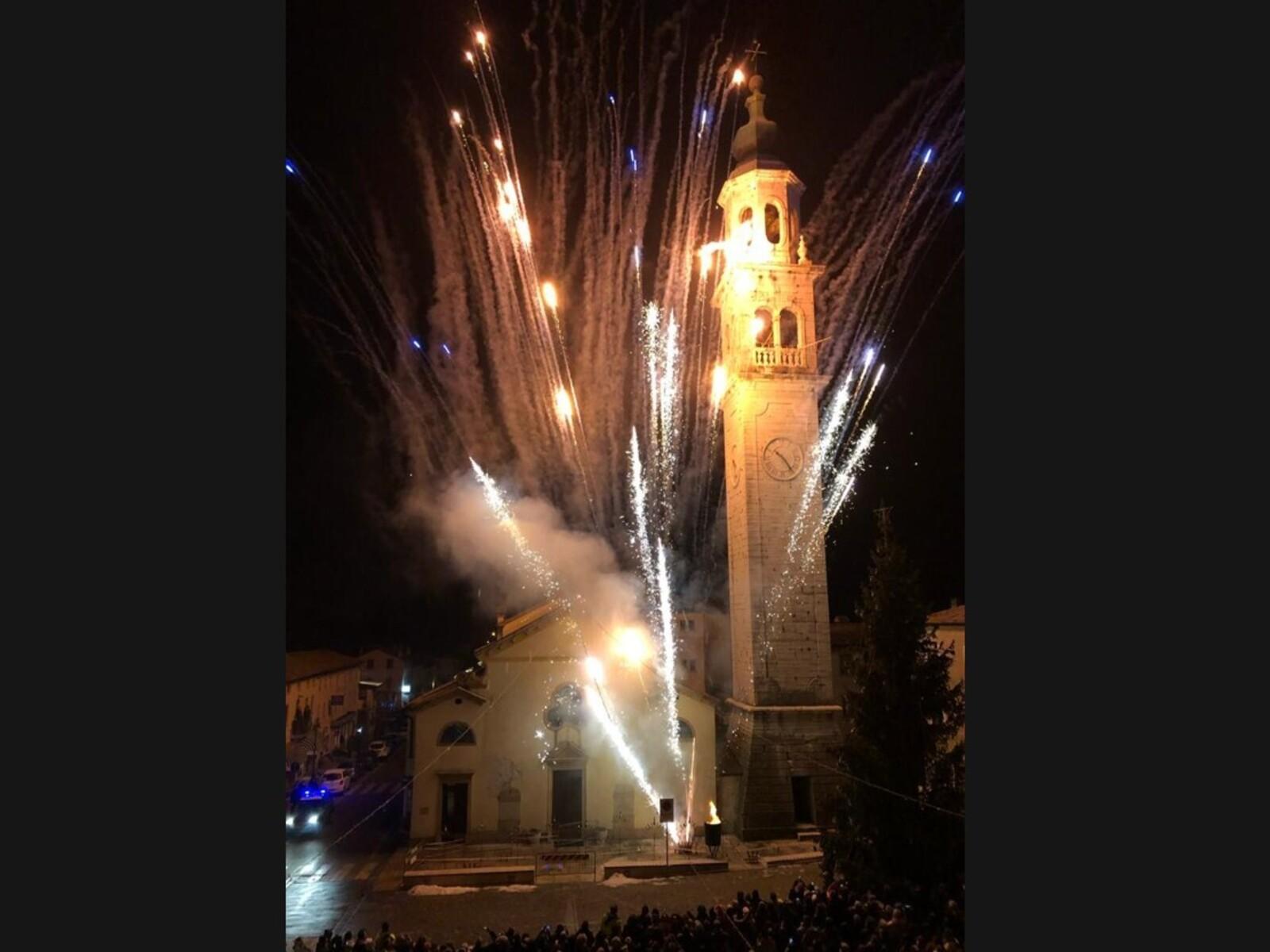A seguire, un’esibizione di particolare suggestione che unisce la giocoleria di fuoco alla narrazione animerà la piazza. La serata continuerà con lo spettacolo pirotecnico e la spettacolare cascata dal campanile!
