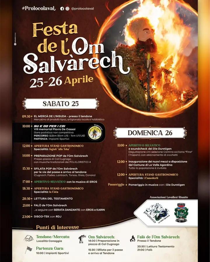 Questo personaggio silvano è molto schivo e non vuole essere visto dall’uomo, tranne nel giorno della sua festa quando viene impersonificato in un grande pupazzo. Così ogni anno il 25 aprile, nel giorno di San Marco, viene realizzato il pop de l’Om Salvarech, un fantoccio in canne di granoturco vestito di stracci, il quale viene fatto sfilare per tutto il paese accompagnato dalle grida dei bambini Viva! Viva l’Om Salvarech!, e alla sera bruciato in un grande falò appena fuori dal centro abitato.