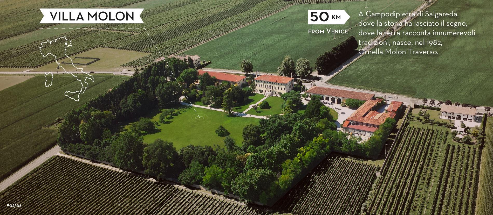 <p>Villa Giustinian – Molon Traverso venne edificata attorno al 1680 per volere del nobile veneziano Girolamo Giustinian appartenente al ramo “delle Acque”, dal nome della calle veneziana, non lontano da Rialto, dove sorgeva la loro dimora.</p><p>Dal 1711 al 1735 il vescovo di Torcello, Venezia, Marco Giustinian trascorse le vacanze estive in Villa a Campo di Pietra. Alla sua morte, per testamento, lasciò una somma di denaro per la parrocchia di San Mauro a Campo di Pietra.</p><p>Consultando i libri contabili della famiglia Giustinian, è interessante apprendere della produzione di vino “in caneva de Campo de Piera” e di come poi fosse spedito via fluviale a Venezia o per uso personale in Calle delle Acque o per immetterlo nel mercato.</p><p>Nel Marzo del 1792, per complesse questioni testamentarie, le proprietà passarono ai Querini Stampalia e alla famiglia Morosini Gatterburg. Quest’ultima successivamente cedette gran parte di quanto ereditato. “IL DOMINICALE DI CAMPO DI PIETRA”, così veniva chiamata la proprietà dai Querini Stampalia, visse un periodo di ampliamenti agronomici e di prosperità, grazie anche alle bonifiche di alcuni terreni circostanti la Villa e all’allevamento dei bachi da seta.</p><p>Nel 1851, il Conte Giovanni Querini partecipò alla prima esposizione universale (Londra) con la seta prodotta nella filanda di Campo di Pietra aggiudicandosi un importante riconoscimento.</p><p>Il dominicale rimase alla Famiglia Querini sino al 1869 quando l’ultimo membro della famiglia, il Conte Giovanni Querini Stampalia, morì. Nel suo testamento lasciò tutte le sue proprietà per la costituzione della Fondazione Pia Querini Stampalia di Campo Santa Maria Formosa, Venezia. La Fondazione è tutt’oggi esistente e apre al pubblico il proprio museo e la biblioteca. Tuttavia nel corso degli anni, per mantenere la fondazione, gran parte delle proprietà nell’ entroterra veneto furono vendute così come la Villa di Campo di Pietra.</p><p>Nel 1909 la Villa passava a Giuseppe Tommaseo Ponzetta che in breve tempo la rivendeva alla famiglia Tagliapietra.</p><p>Nel 1917 passava nelle disponibilità di Guido Carretta di Santa Maria di Campagna, il quale creò di fatto, in unione all’allevamento dei bachi da seta, un’azienda agricola di un migliaio di ettari con campi vitati, frumento e grano.</p><p>Nel 1918, la Villa trovandosi a circa 3 km dal fiume Piave, durante la fase finale del primo conflitto mondiale, fu occupata dalle truppe austriache e colpita da alcuni colpi dell’artiglieria italiana subendo pesanti danni. Tra il 1919 e il 1923 il complesso venne riportato alla situazione originale e ingrandito con la costruzione di nuove cantine.</p><p>Nel 1969 la Villa venne iscritta all’istituto Regionale Ville Venete, apponendole, così, il vincolo di protezione strutturale tutt’ora in essere.</p><p>Nel 1995 la Famiglia Molon Traverso acquistò la Villa e con coraggio, impegno e passione iniziò una lunga ristrutturazione, riportandola ai tempi gloriosi della Serenissima Repubblica di Venezia. L’inaugurazione avvenne nell’agosto 1996.</p><p>Nel 2015, Villa Giustinian – Molon Traverso è stata insignita dall’Istituto Regionale Ville Venete a Palazzo Ducale in Venezia con il premio “Miglior Villa Veneta 2015” per l’attività svolta e l’impegno profuso a favore della conservazione e valorizzazione di Villa Molon.</p><p>Oggi le strutture ospitano come in passato le cantine d’invecchiamento, la piccola Osteria, il wine shop con eccellenze gastronomiche, il museo di civiltà contadina, gli uffici amministrativi e degli spazi destinati ad eventi di vario genere.</p>