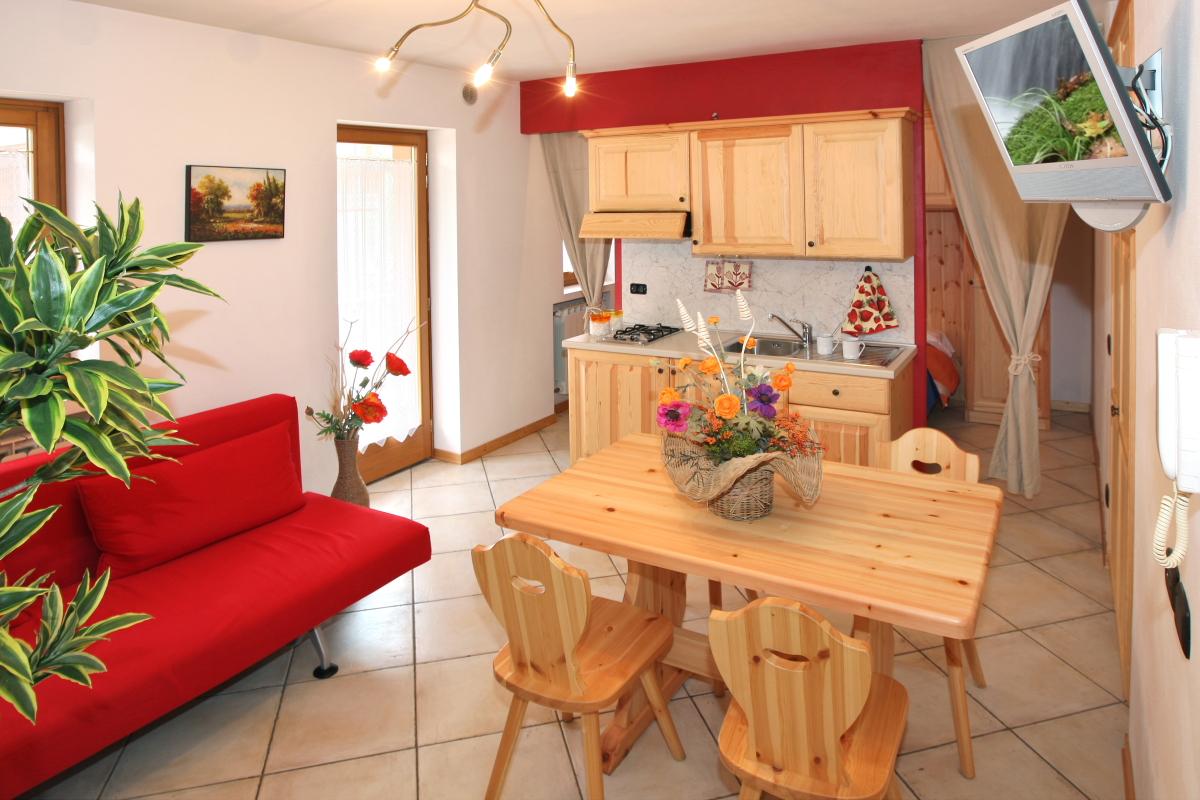 L'appartamento si sviluppa al primo piano, è composto da soggiorno con angolo cottura e divano letto doppio, dietro ad un separé aperto ai due lati, troviamo invece il letto matrimoniale, c'è poi uno spazioso bagno con doccia.