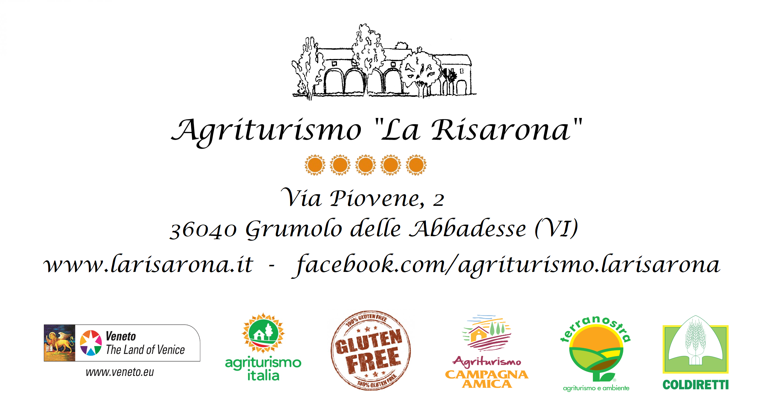 L'Agriturismo “La Risarona” sorge nella suggestiva campagna di Grumolo delle Abbadesse nell'incantevole scenario compreso fra le città di Vicenza e Padova. La struttura si affaccia su un delizioso laghetto che regala agli ospiti il piacere di rilassarsi di fronte ad acque sorgive di antiche risaie, luogo ideale per trascorrere un soggiorno immersi nella natura. Le camere, una diversa dall’altra, sono arredate con colori caldi e materiali naturali che rendono l'atmosfera intima e suggestiva, garantendo ogni confort. Non mancano gli spazi interni per il relax o per gustare una ricca colazione a base di prodotti casalinghi. Gli amanti della natura potranno dedicarsi a piacevoli passeggiate a piedi o a rilassanti gite in bicicletta nei dintorni. A seguito della classificazione delle aziende agrituristiche previste da LR 28/2012, la nostra azienda ha ottenuto 5 girasoli.