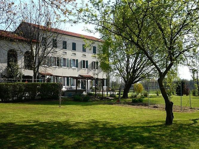 No exterior, o jardim e o pátio imersos na campanha trevigiana oferecem um espaço ideal para momentos de tranquilidade, leitura ou convívio ao ar livre.